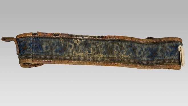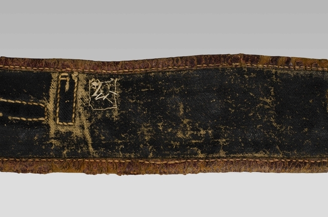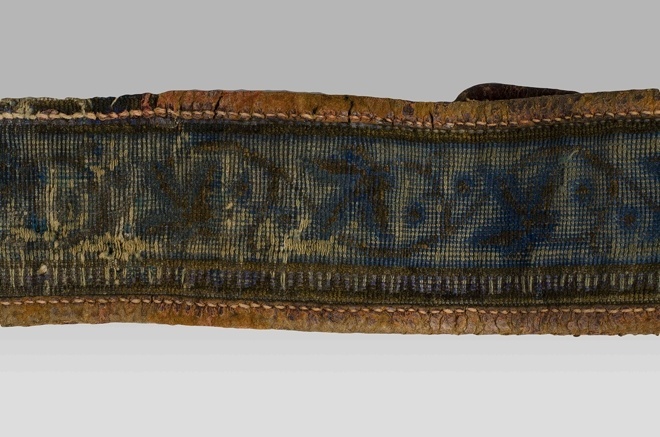 Tuigje van pluche met leer afgezet, oorspronkelijk blauw met zwart
