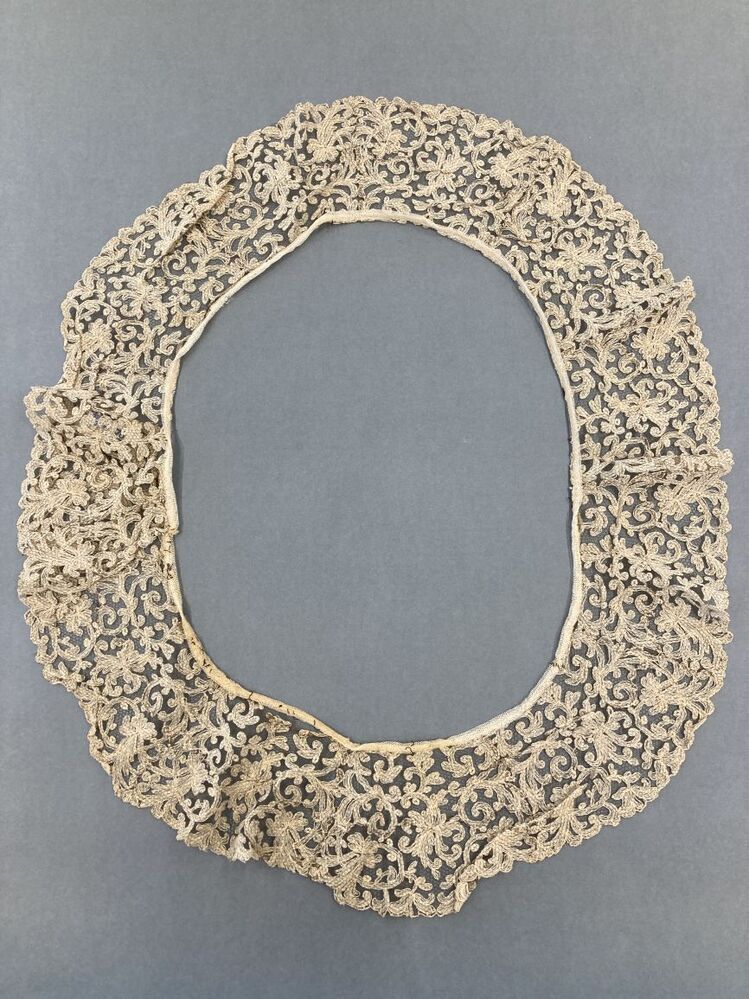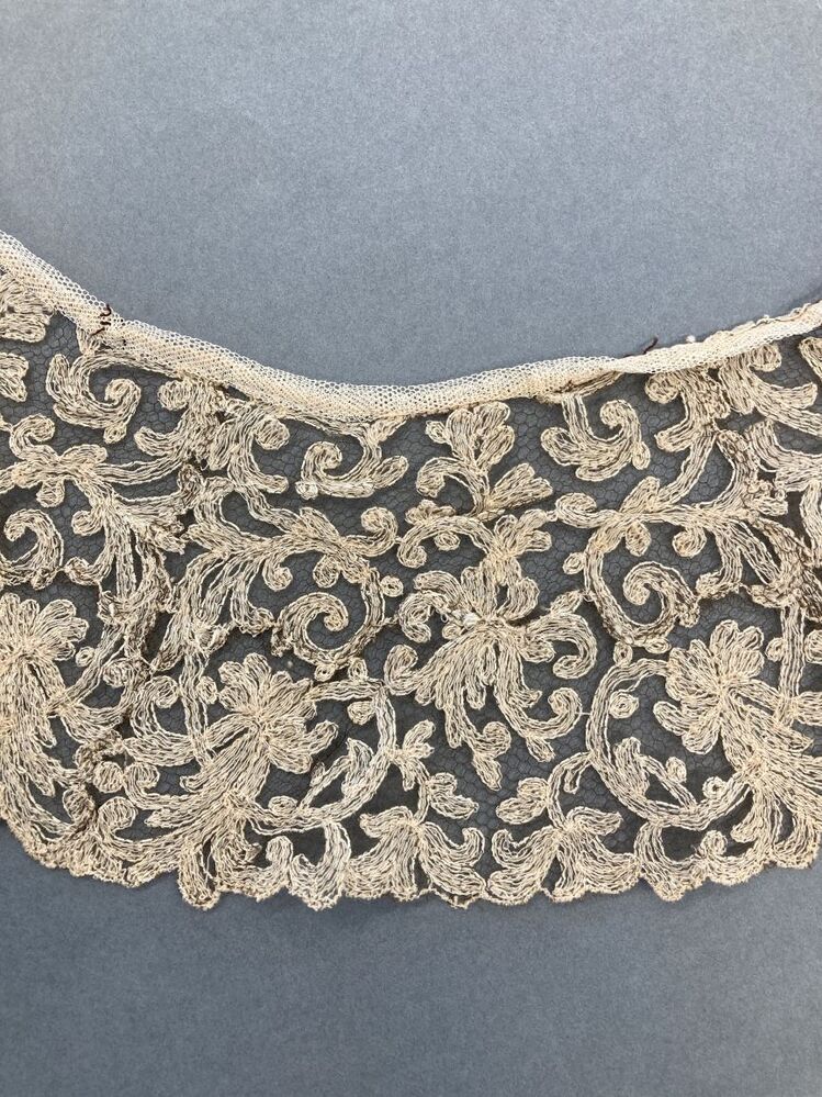 Strook kant, klokkend gezet aan een reep fijne beige tule, toegepast als volant-kraag of berthe, van geborduurde tule