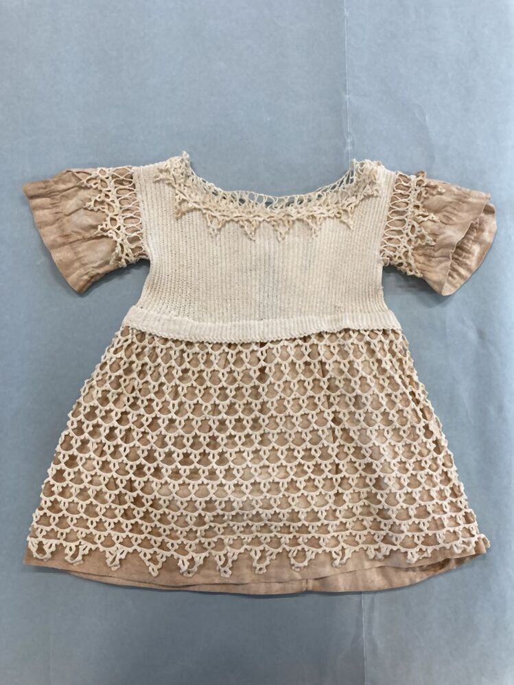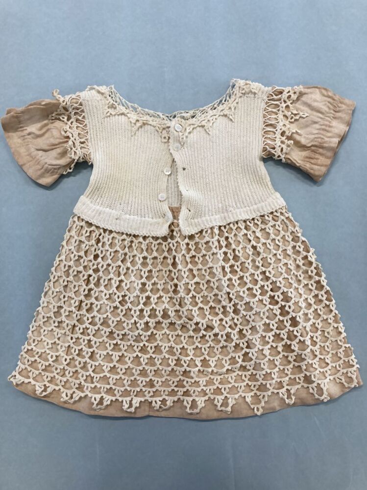 Gehaakt kinderjurkje met ajourhaakwerk rok en mouwtjes gevoerd met keperkatoen