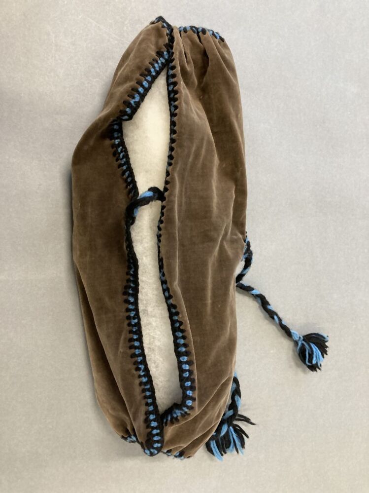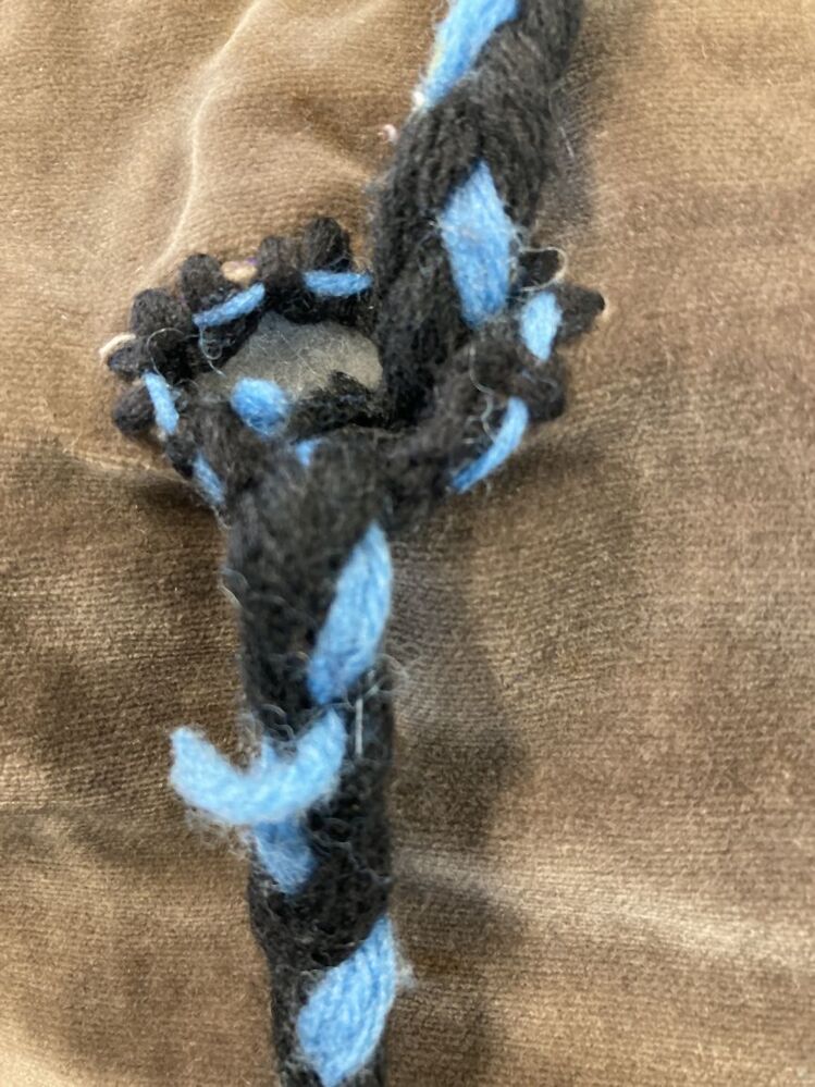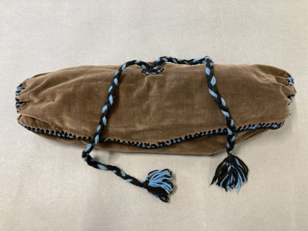 Breitas, langwerpig, van muisgrijs fluweel, omgehaakt met zwart en lichtblauwe wol