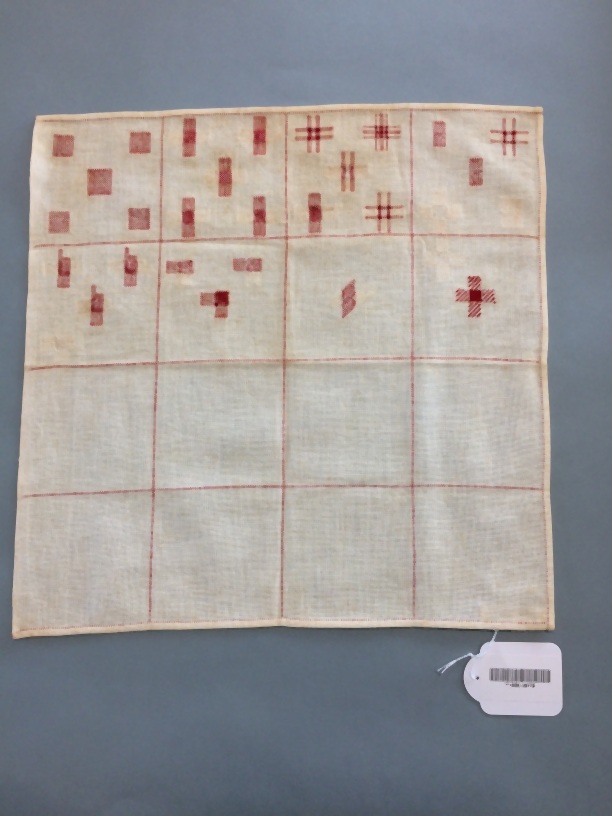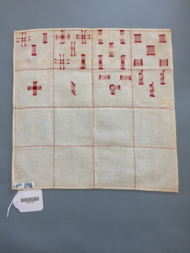 Stoplap van katoenen stramien verdeeld in zestien vakken, per vak vijf stoppen