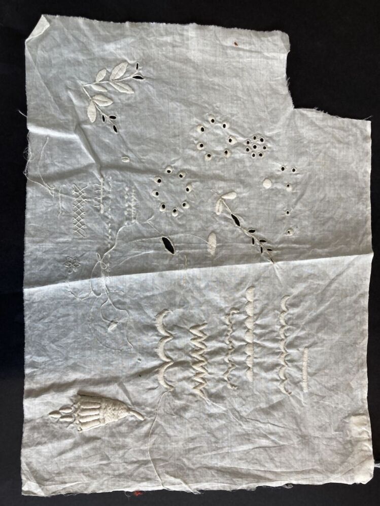 Proeflap met randjes en motieven in witborduurwerk