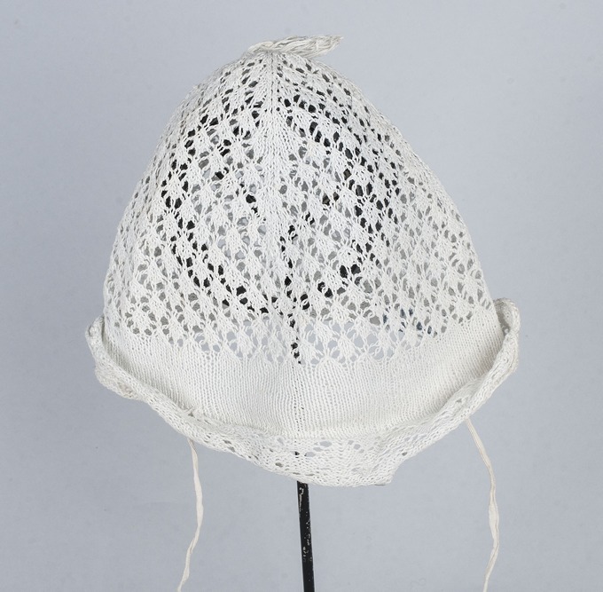 Muts, gebreid, ajourpatroon van wit katoen, onderdeel van groep van vijf