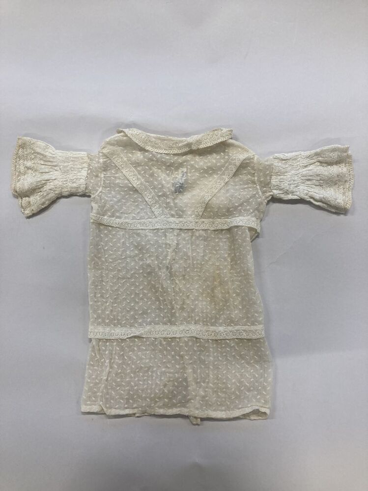 Japonnetje van wit neteldoek met kleine diagonale gebrocheerde streepjes