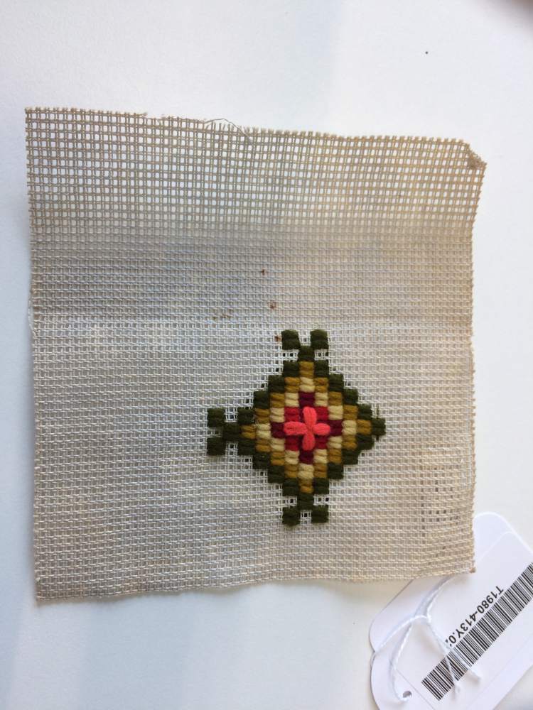 Proefstukje van textiel technieken, bevestigd op een roze kaart