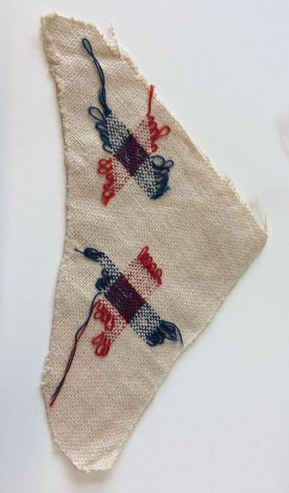 Proefstukje van textiel technieken, bevestigd op een roze kaart