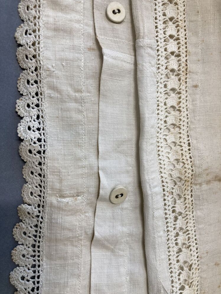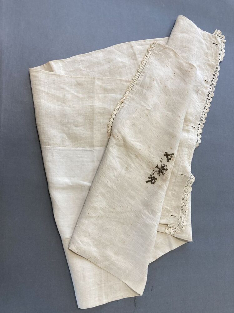 Peluwsloop van grof wit linnen met borduursel: levensboompje, 1830 VR met gehaakte kant en eutredeux