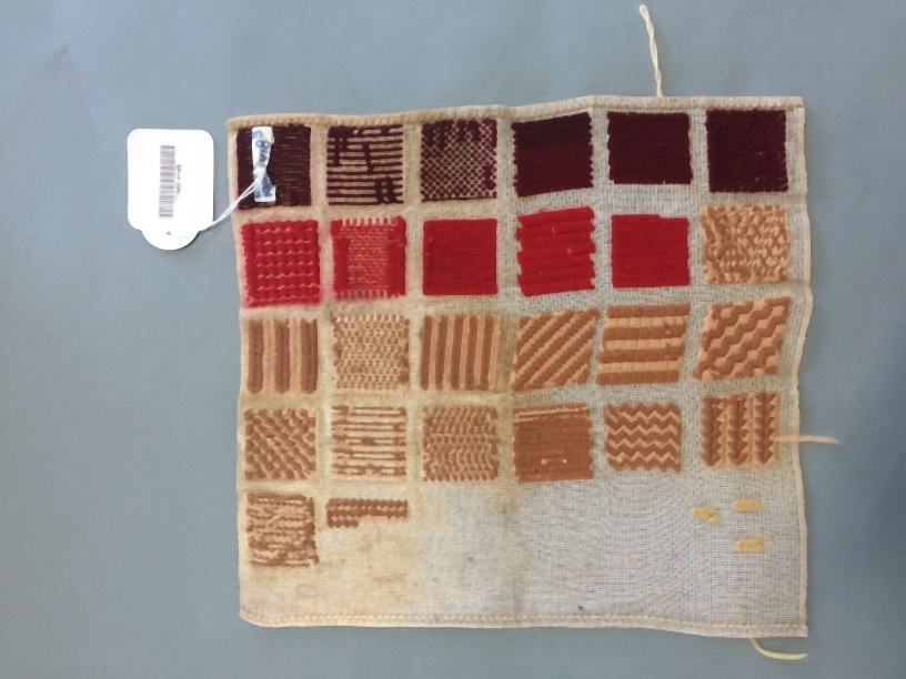 Proefstuk tapisserie, L-vormig lapje stramien, geborduurd, koninginnesteek, roemeense steek, platsteek, kruisjes