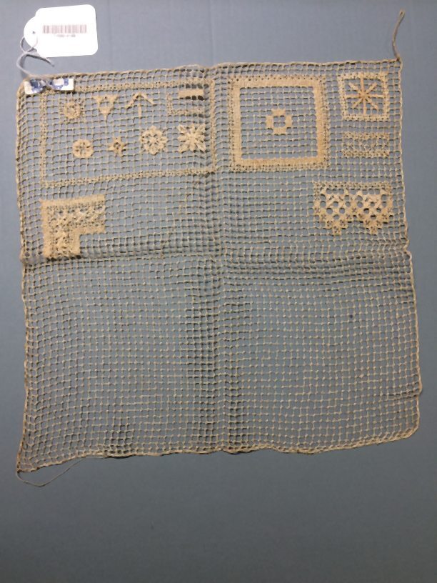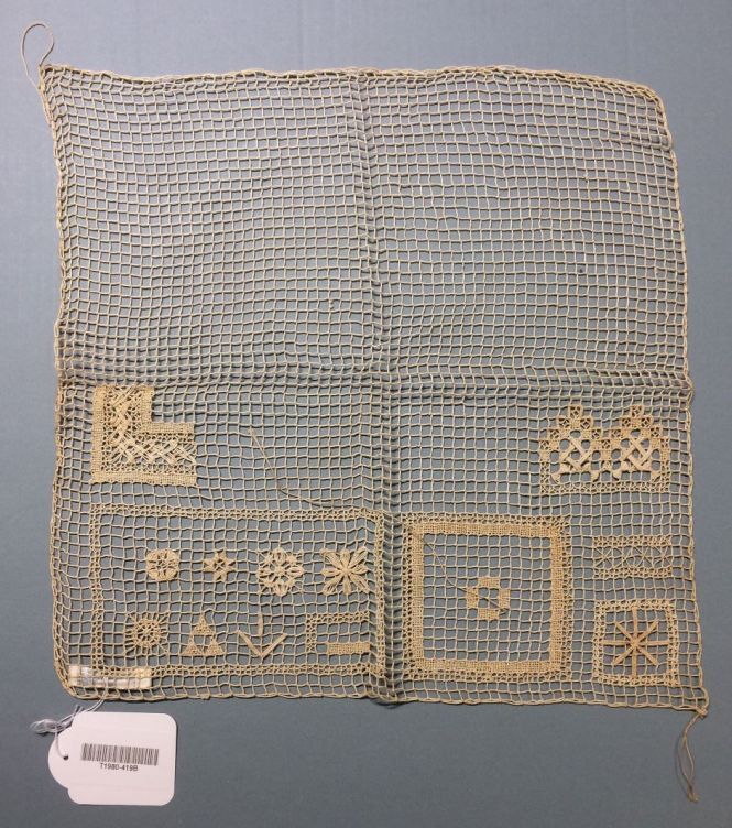 Proefstuk doorstoppen, katoenen filet, vissersgaren, point d'esprit, point de repise, point de toile en naaldkant