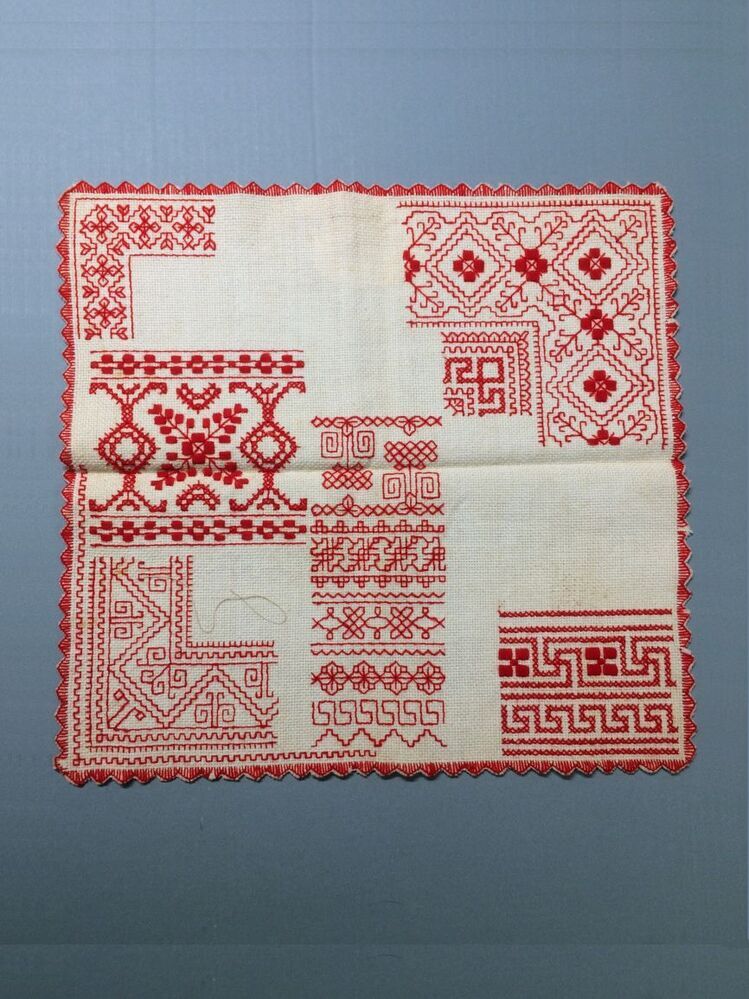 Proefstuk holbein, crème wollen stof, panamabinding, borduursel met rode wol, diverse randen