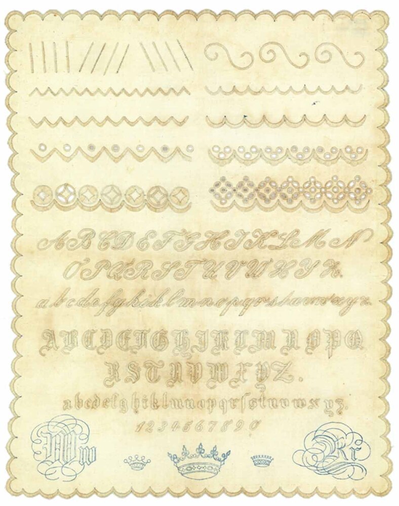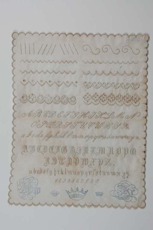 Witwerklap op voorbedrukt katoen, met Engels en Frans borduurwerk, initialen W. R, ongedateerd