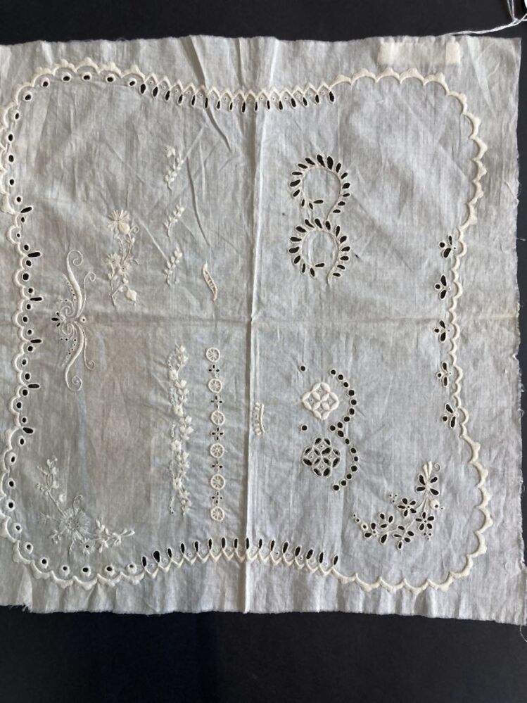 Proeflap witwerk, Engels en Frans borduurwerk op fijne witte batist, met boeketjes, randjes, akkoladevorm en hoekmotieven