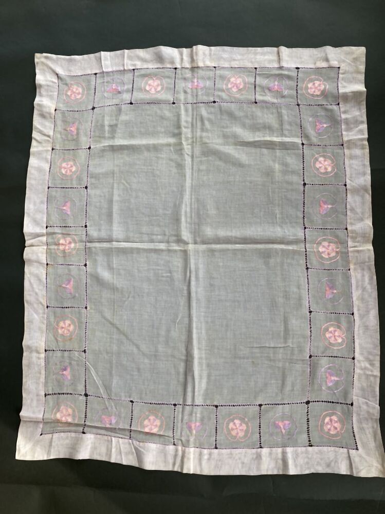 Theekleed van lila voile, langs zoom blokken met open randen, waarin cirkelvormig motief met bloem