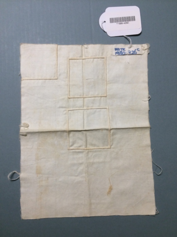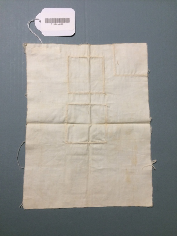 Naailap van wit katoen met ingeweven strepen, door rode draad verdeeld in zestien vakken