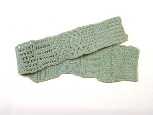 Proeflap breien, lichtblauwe wol, 17 verschillende steken, o.a. patentsteek en ajourwerk, onderdeel van groep van drie