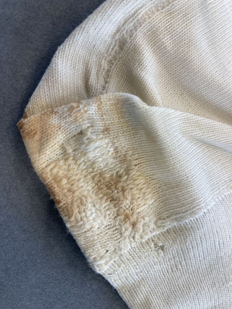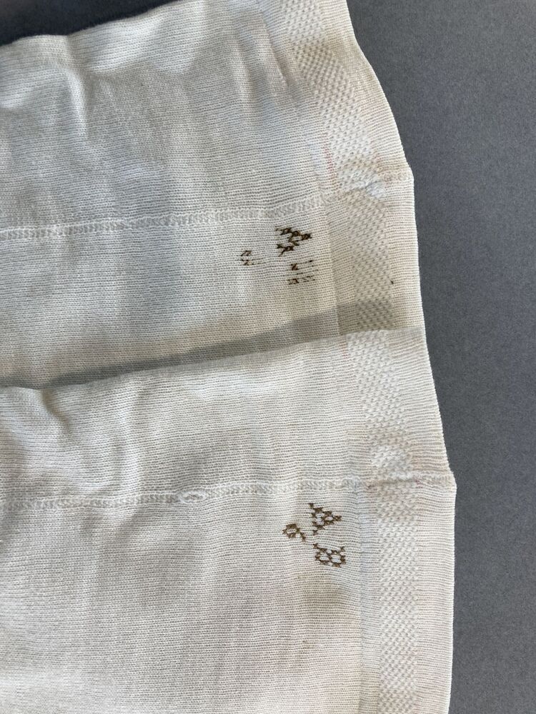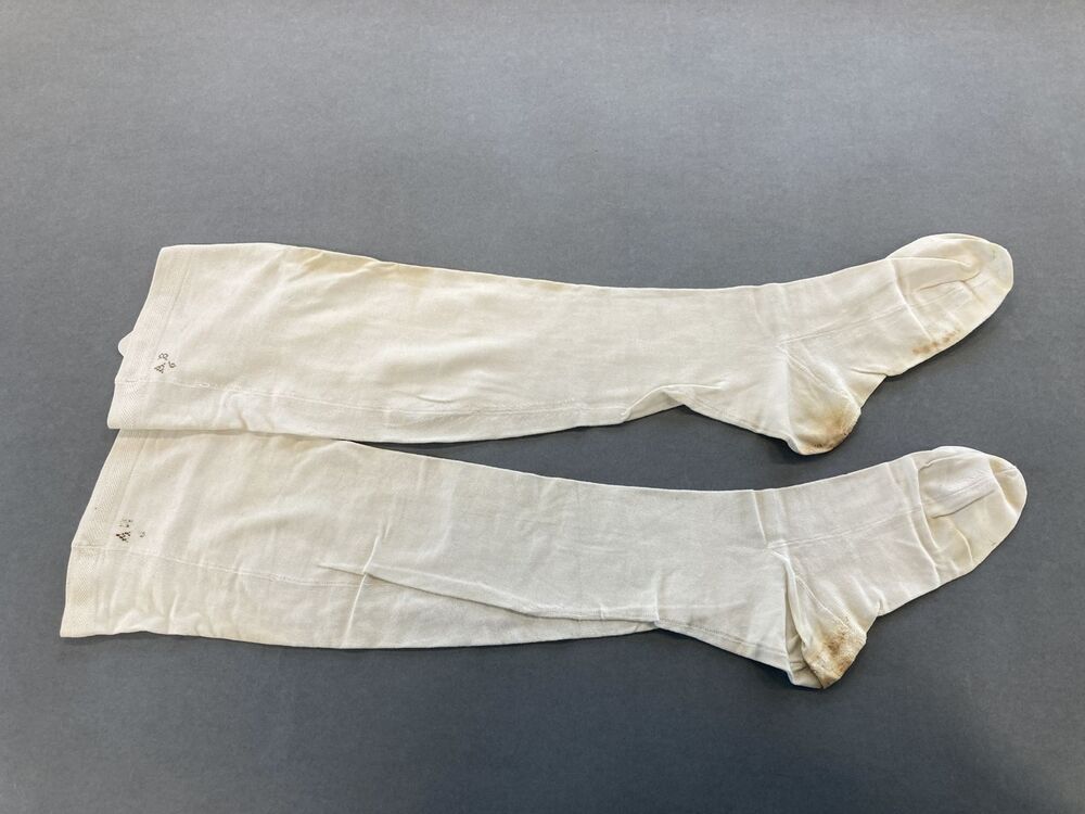 Paar witte katoenen kousen machinaal gebreid, gemerkt AB 6