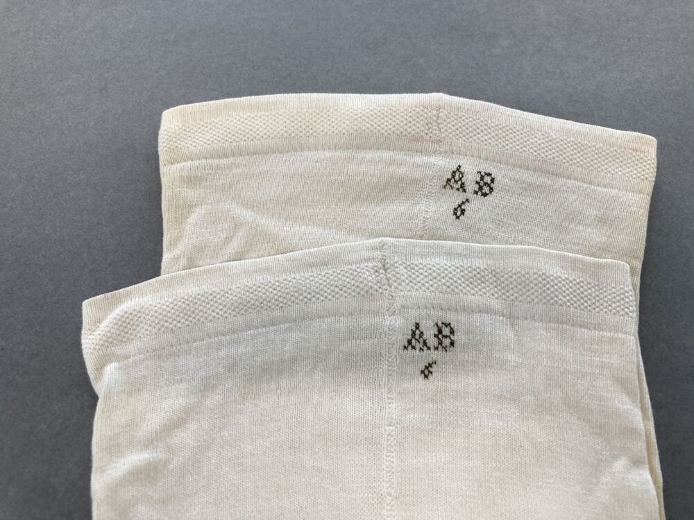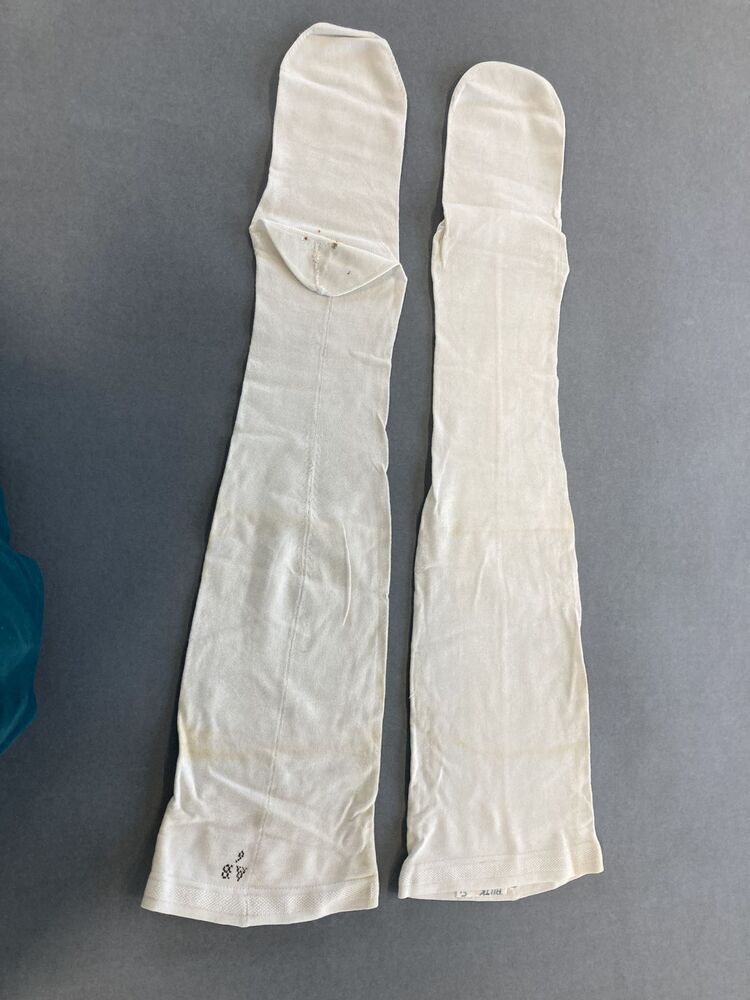 Paar onbewerkte katoenen, machinaal gebreide kousen gemerkt AB 6