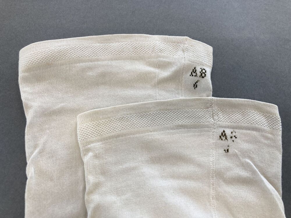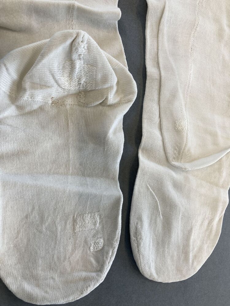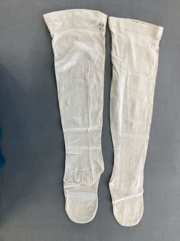 Paar witte onbewerkte kousen, machinaal gebreid,gemerkt AB 6