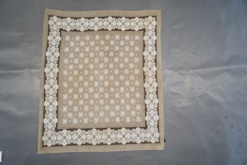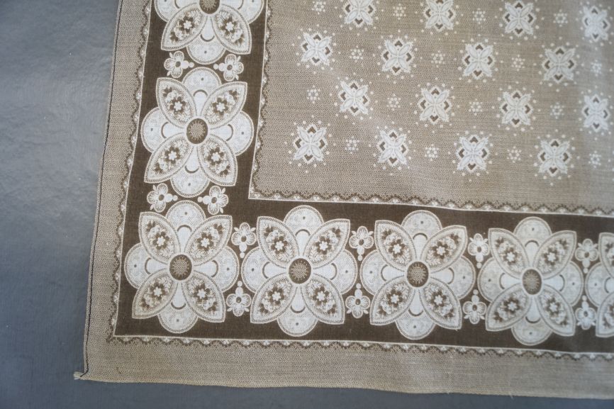 Doek van wit katoen bedrukt in bruin met gestileerd bloempatroon en stippeltjes en brede rand met gestileerde bloemen.