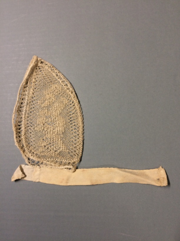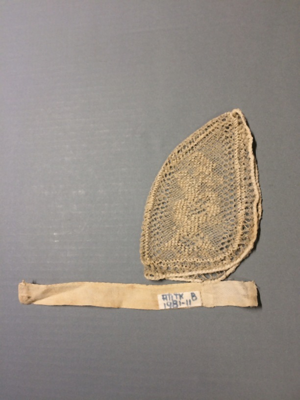 Bol van floddermuts, van filetknoopwerk, met twee diktes vissersgaren geknoopt