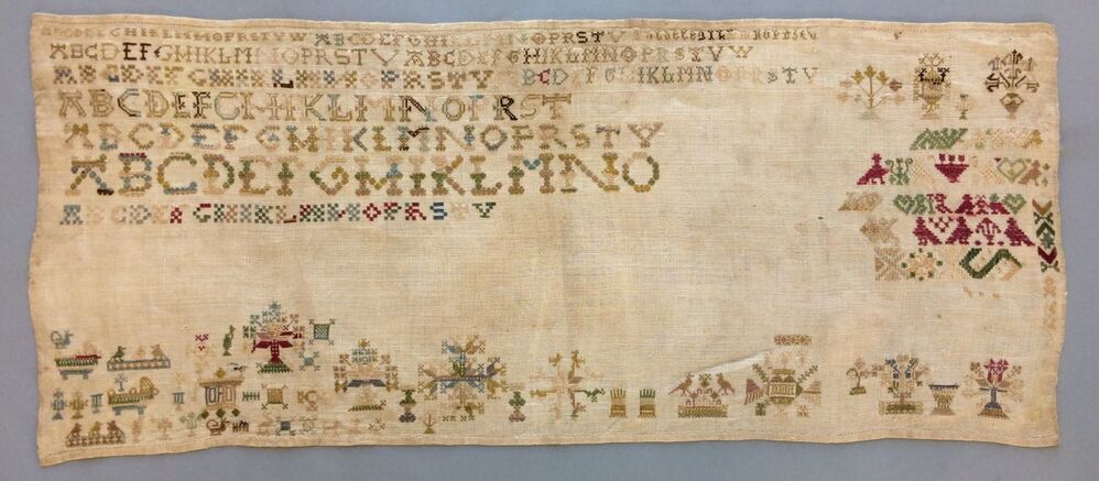 Lettermerklap, zijden kruissteek op linnen, elf alfabetten, met als merken levensbomen, vogels en vierkantjes