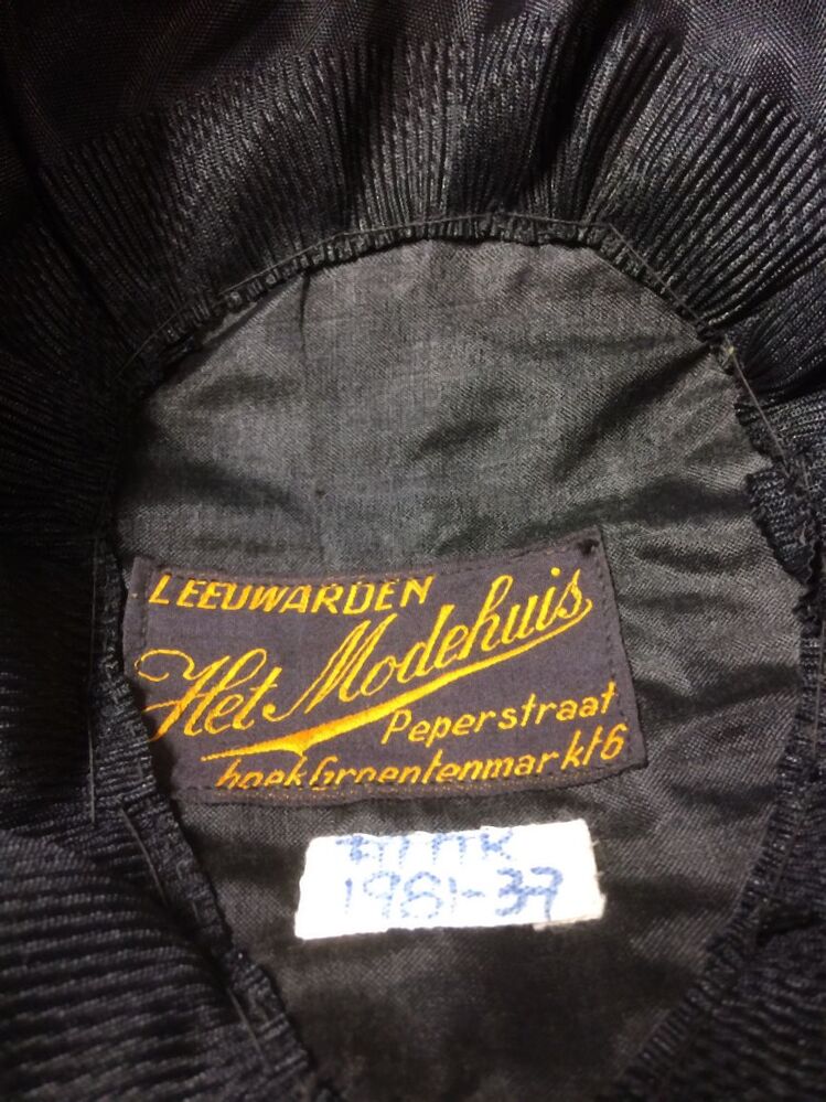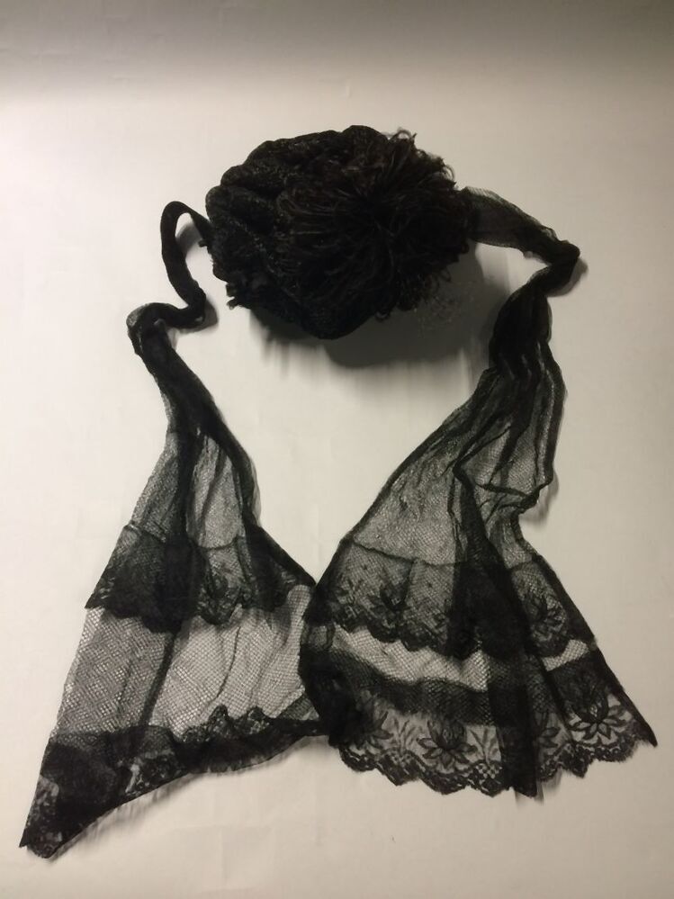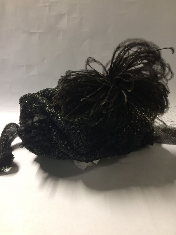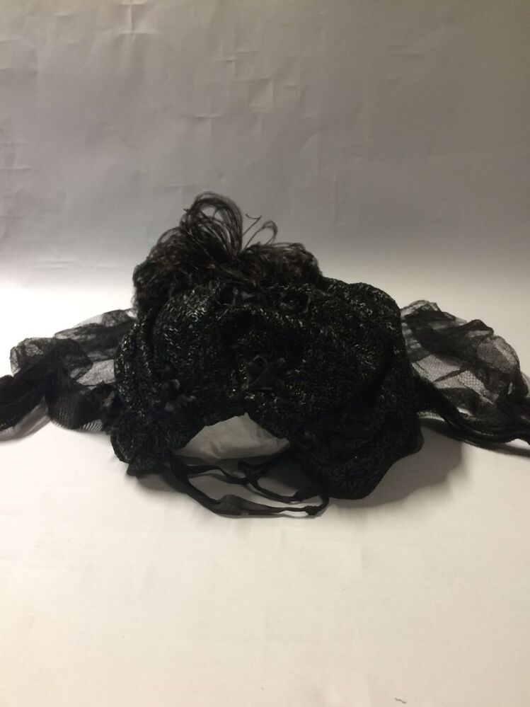 Kypske, frame van omwoeld ijzerdraad met bloemetjes van zwarte kunstzijde, rozetten en zwarte struisveren