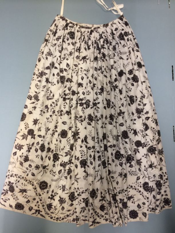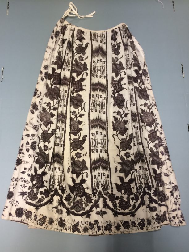 Sitsen vrouwenrok,gemaakt van twee monochrome randstoffen, achter met doorlopende ranken, voor met banen van afwisselend een bloemrank en een band met ikatmotief.