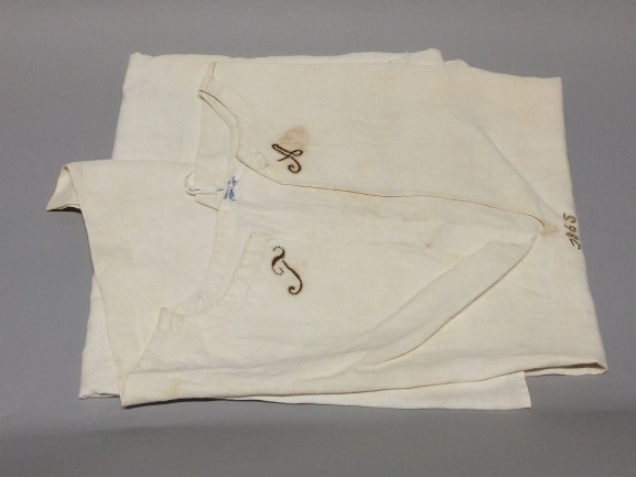 Mannenhemd gemerkt TA 1865, linnen, zonder boord, monogram open kettingsteek, bruine zijde