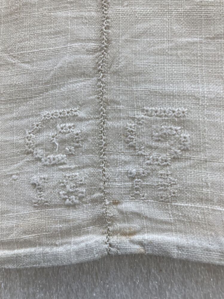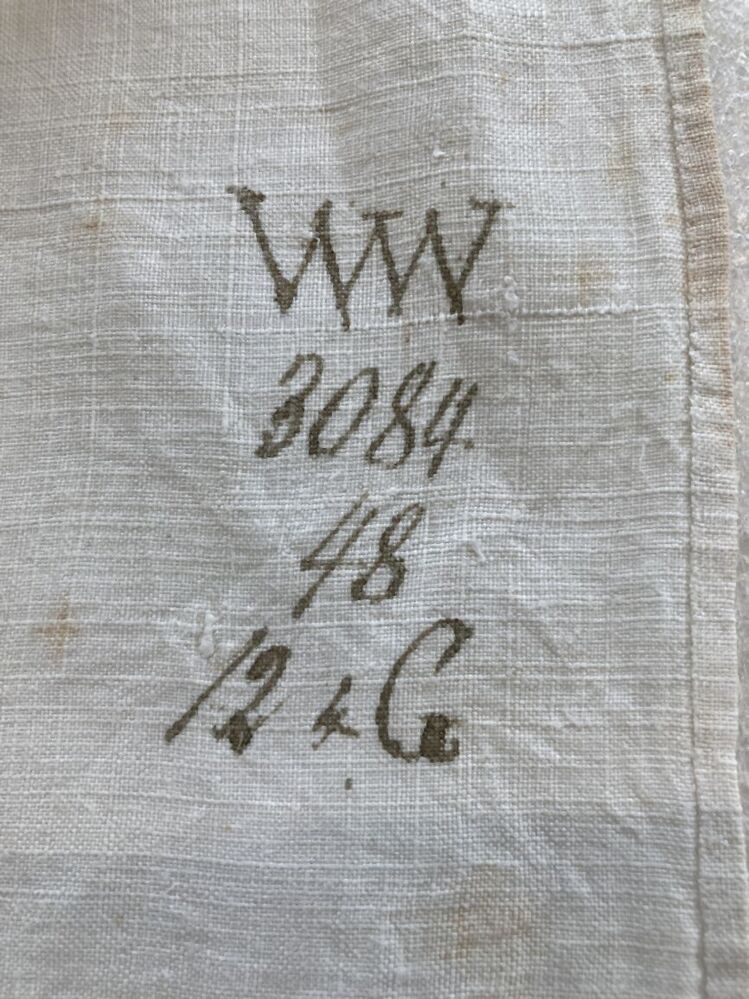 Gordijn van wit linnen lakenmet monogram borduursel GG 1813 en ingeschreven tekst