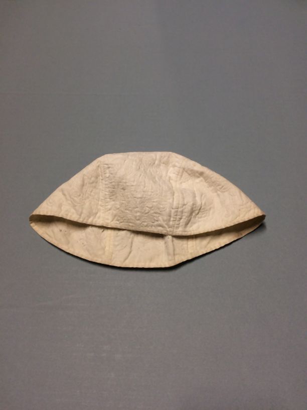 Baby mutsje, linnen, onopgevuld zaans stikwerk, potmotieven (3x) en (1x) spitsovaal