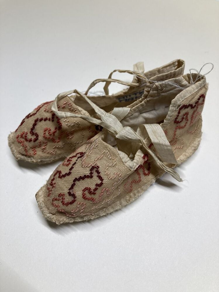 Paar babyschoentjes, ecru gaas met kruissteekborduursel, grillig motief in overlopende nuances, rood-écru