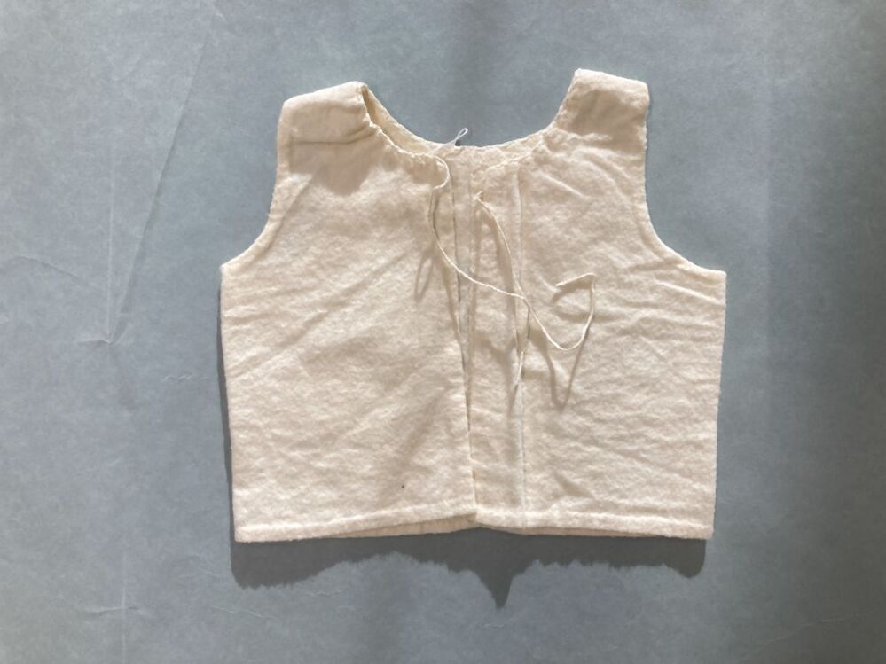 Wit flanellen mouwloos hemdje met gehaakt randje langs hals