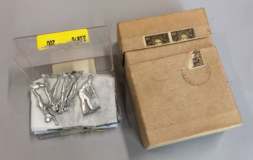 Tinnen figuurtjes bestaande uit dieren en sportende mensen