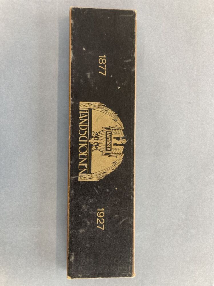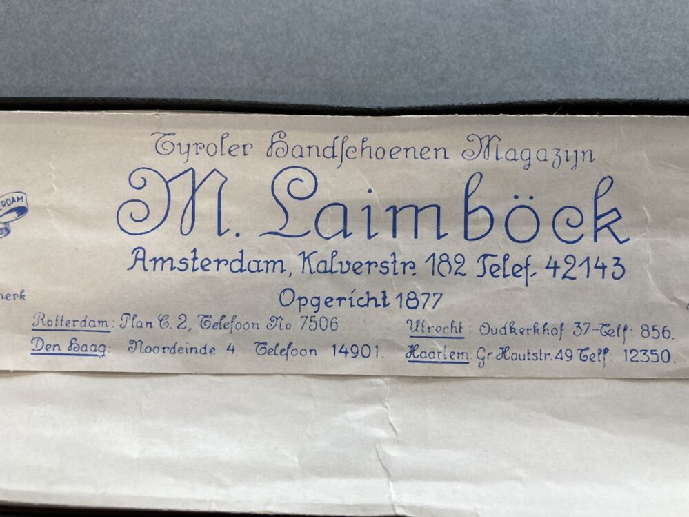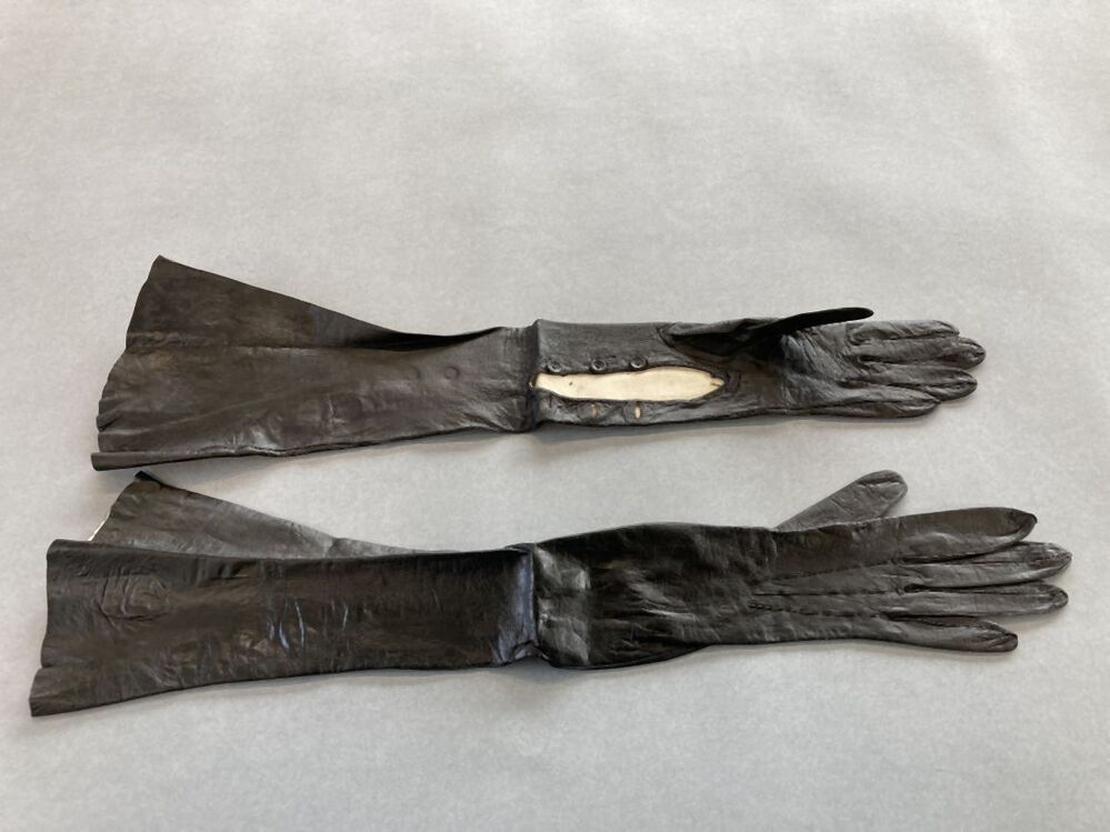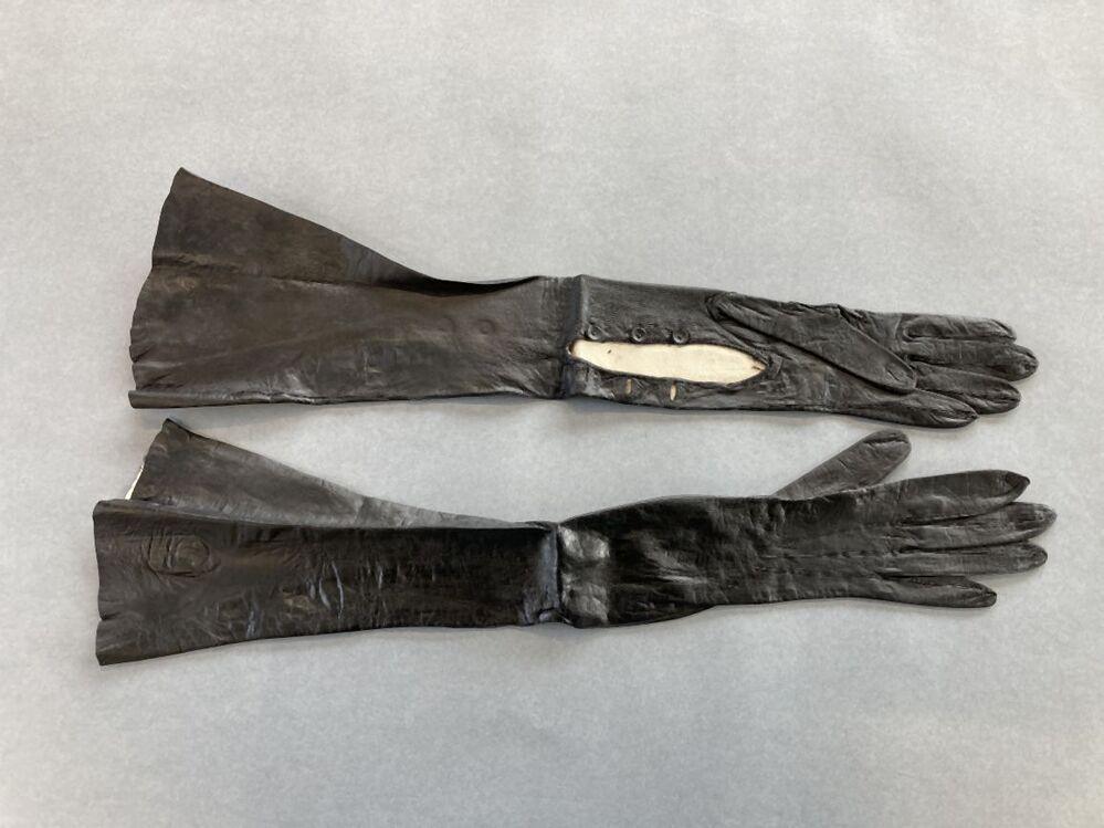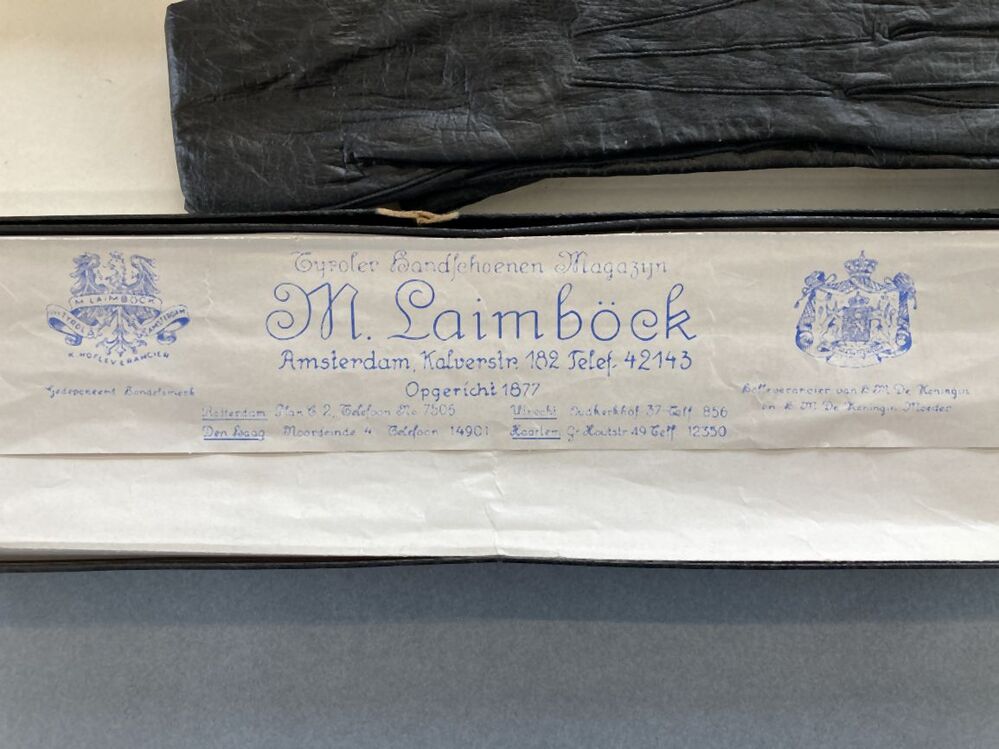 Lange handschoenen van zwart geverfd dun geitenleer, in oorspronkelijke doos