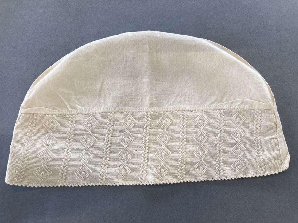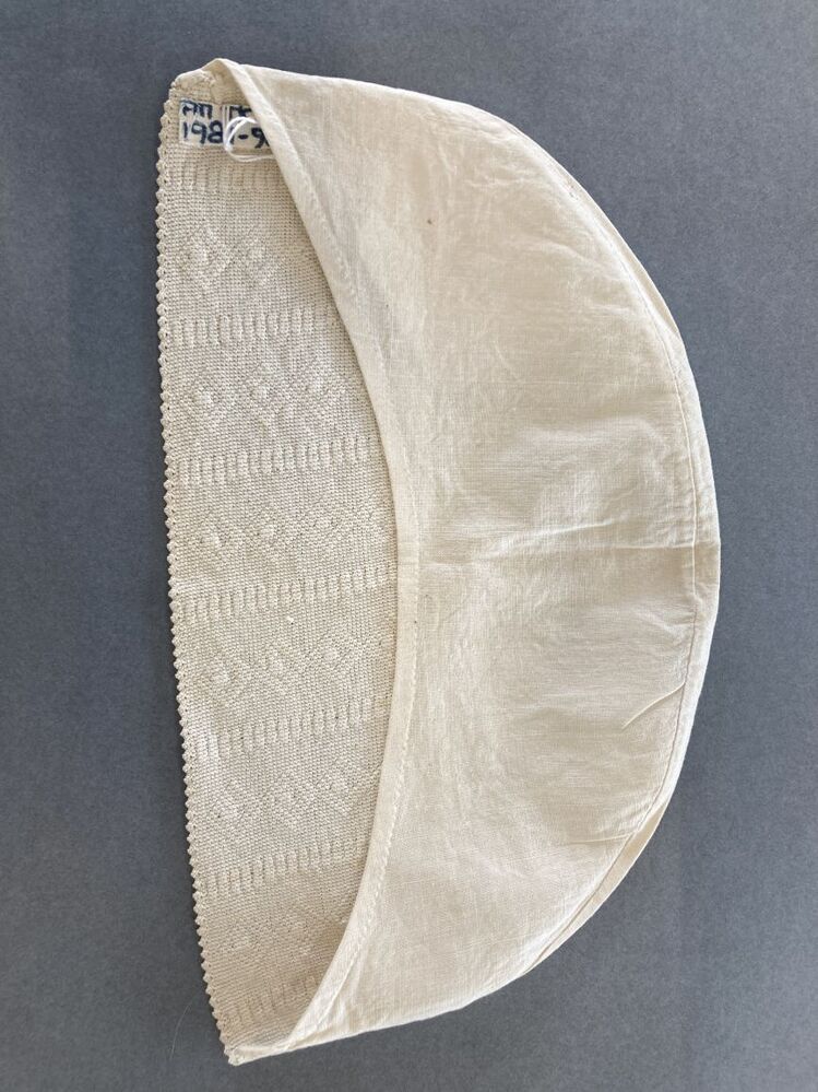 Tipmuts van wit katoen met gehaakte achterstrook met verticale banen van blaadjes en ruiten
