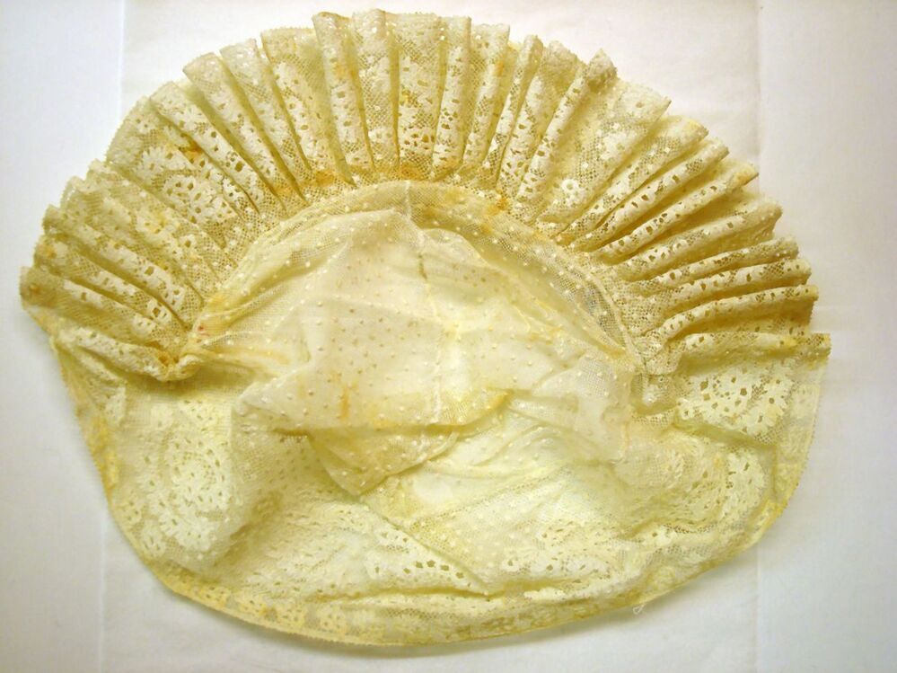 Floddermuts, bol van doorgestopte genopte tule, strook van Rijsselse kant, veermotief