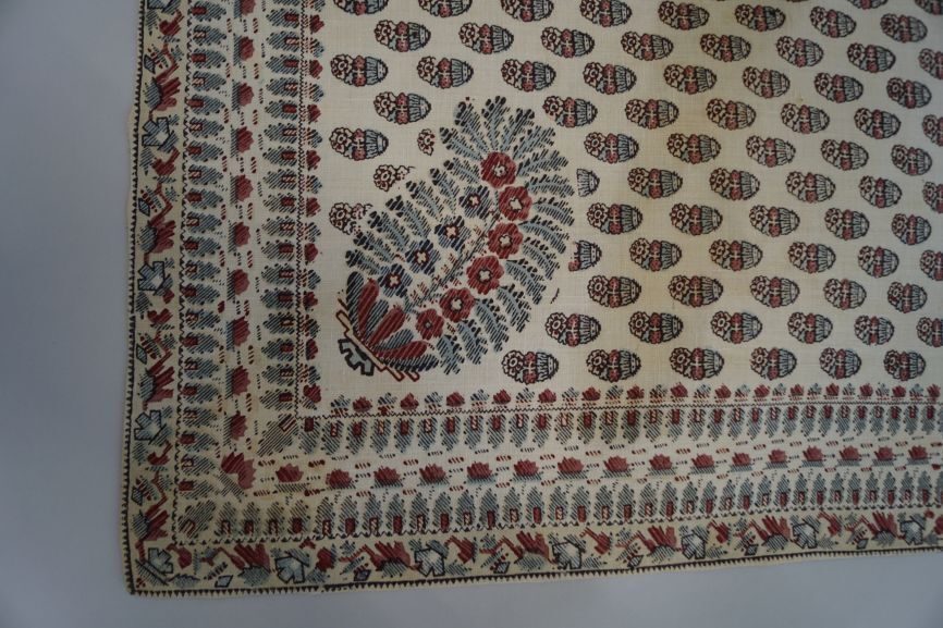 Driehoekige katoenen doek met gestileerde buta-motiefjes en gestreepte rand