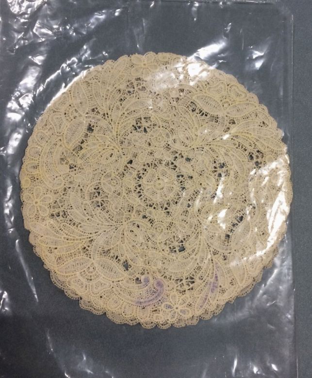 Ronde plastic kleedje, gegoten in mal en gemaakt van een geklost kleedje, onderdeel van groep van drie