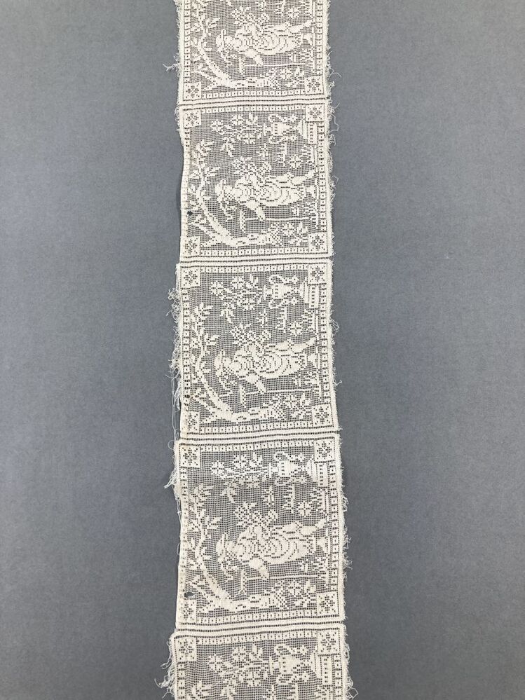 Kant van machinaal filetwerk, vijf blokken met grote orenvaas en vrouwenfiguur met hark bij boom