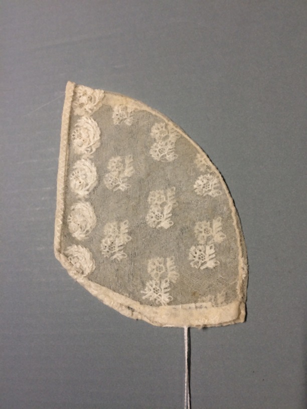 Floddermutsbol van wit linnen tule met floraal strooimotief en rij bloemetjes langs voorrand