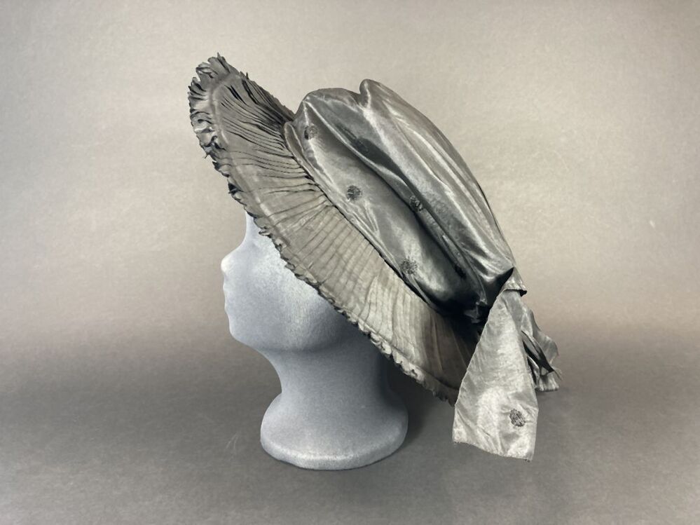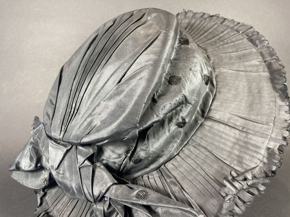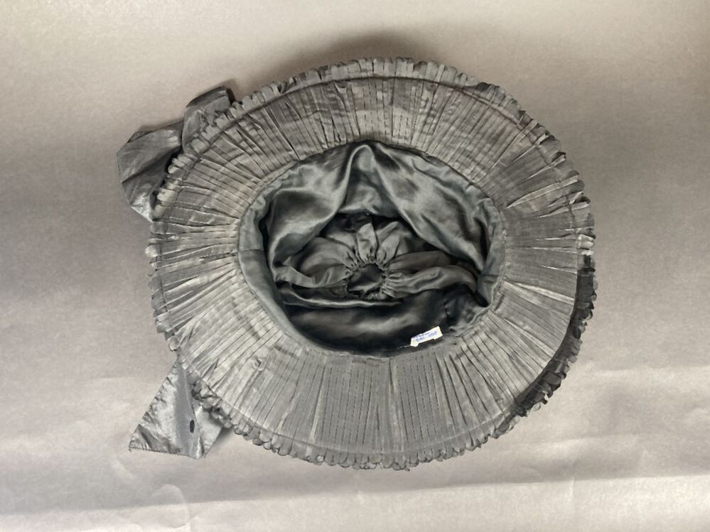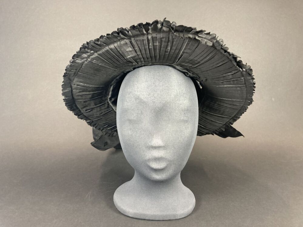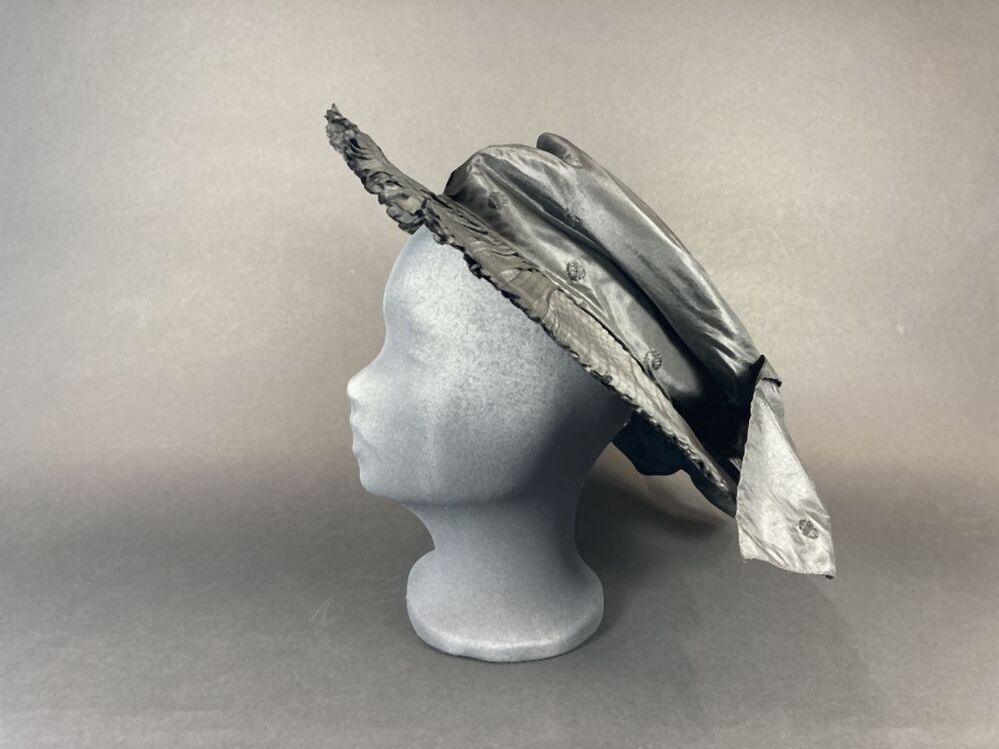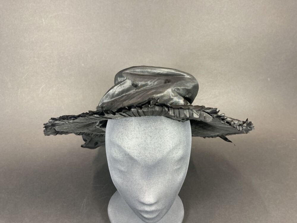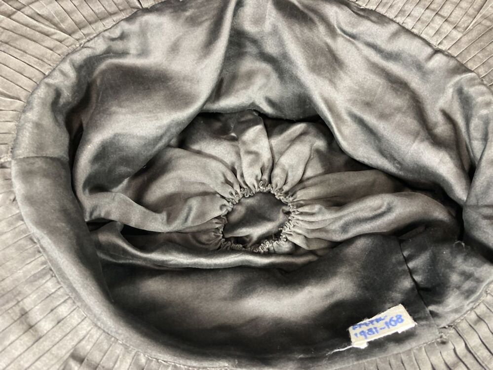 Zwarte hoed met hoge bol met vlakke bovenkant gedrapeerd met zwart glanzende stof