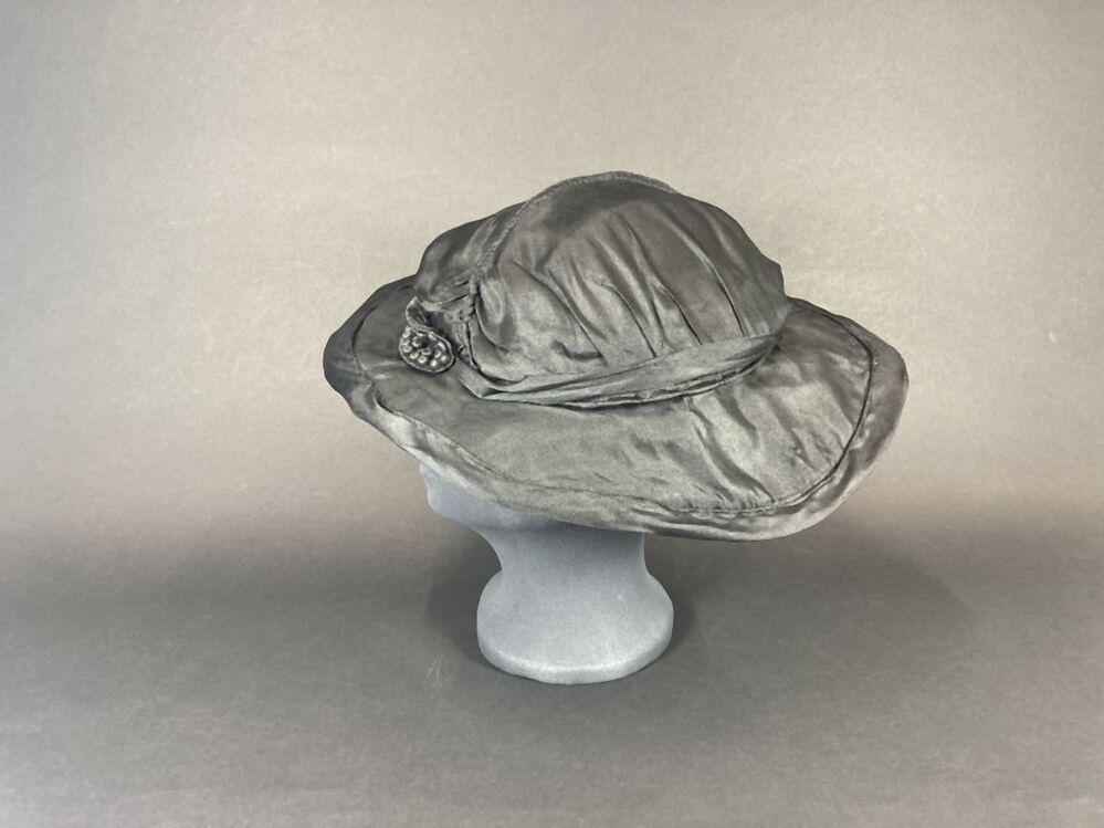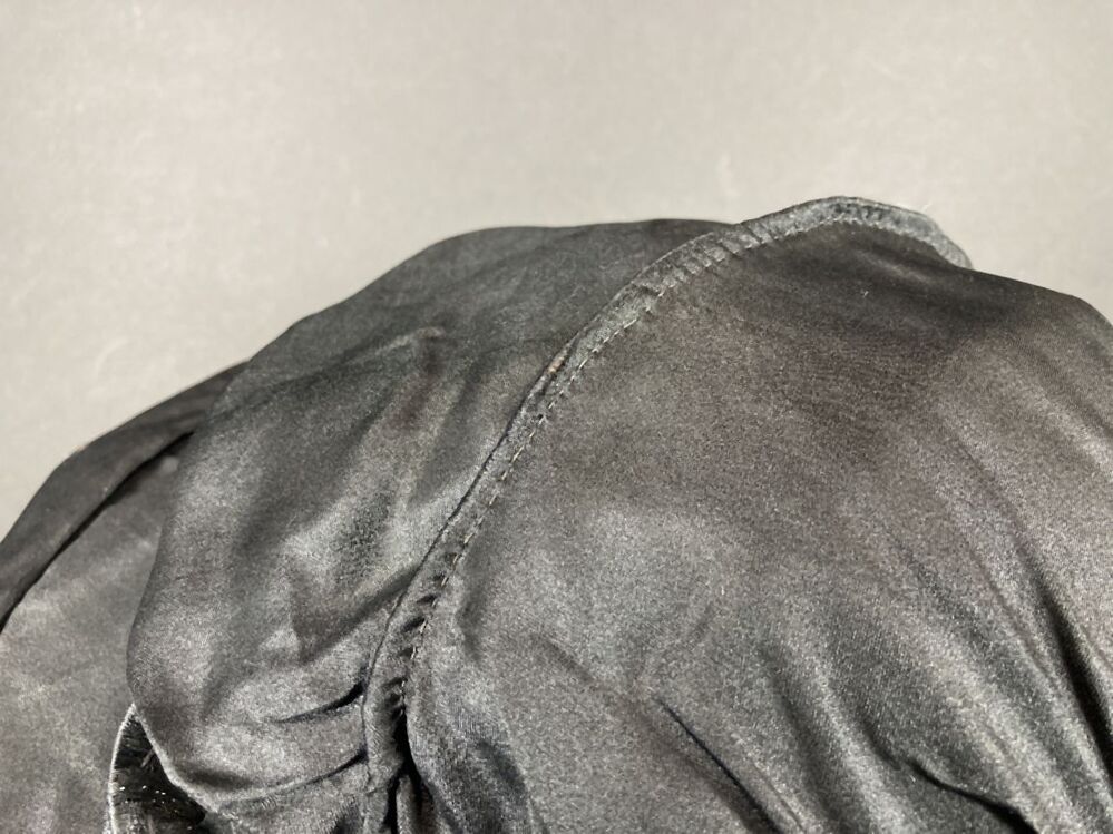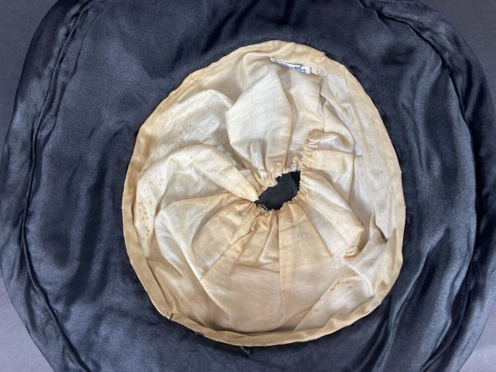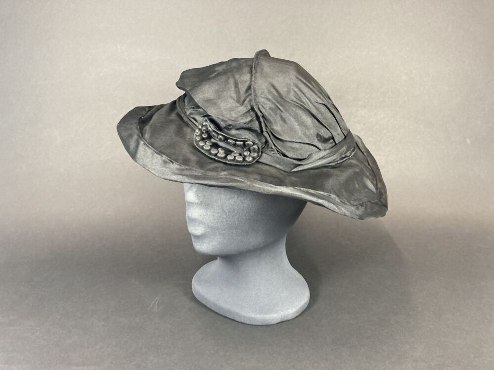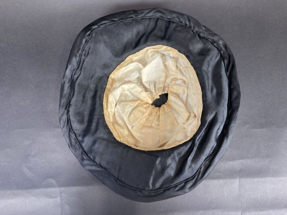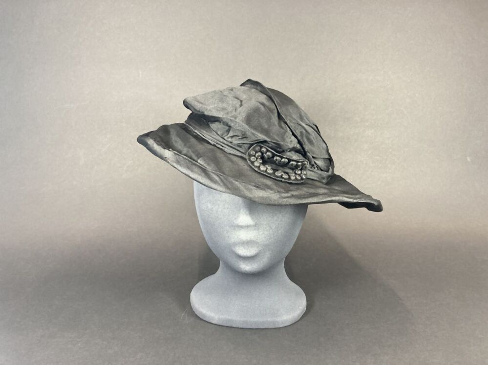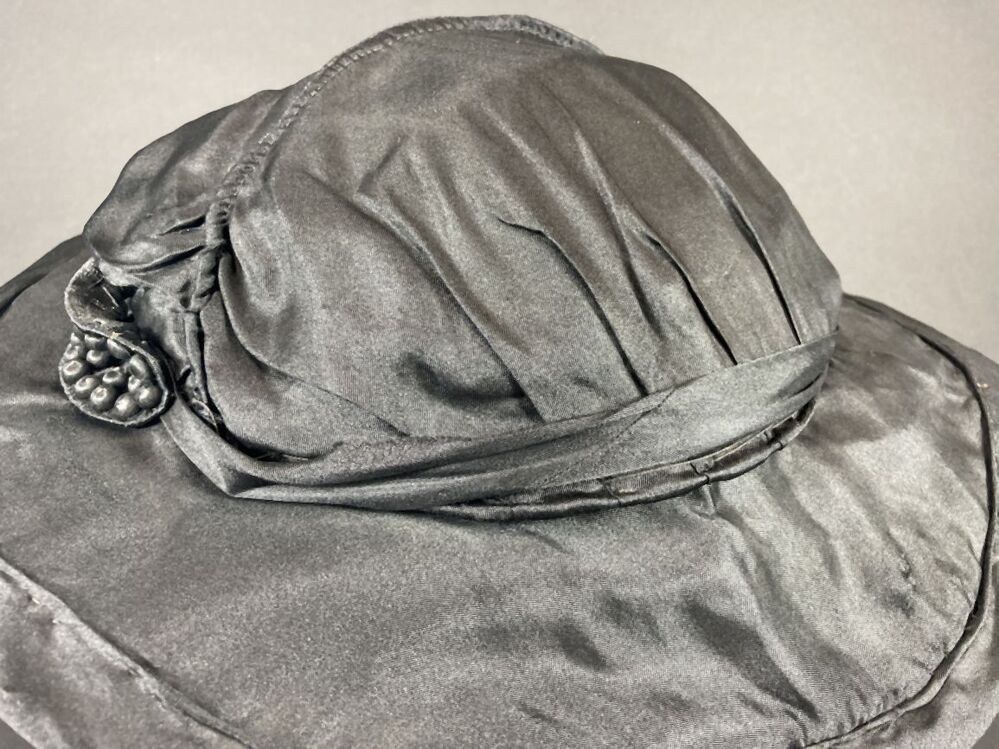 Zwarte a-symmetrische hoed van kunstzijde met ovale versiering met bolletjes