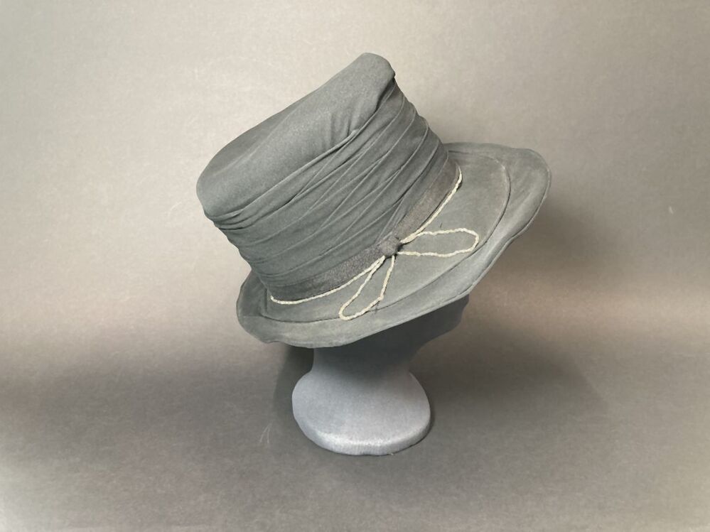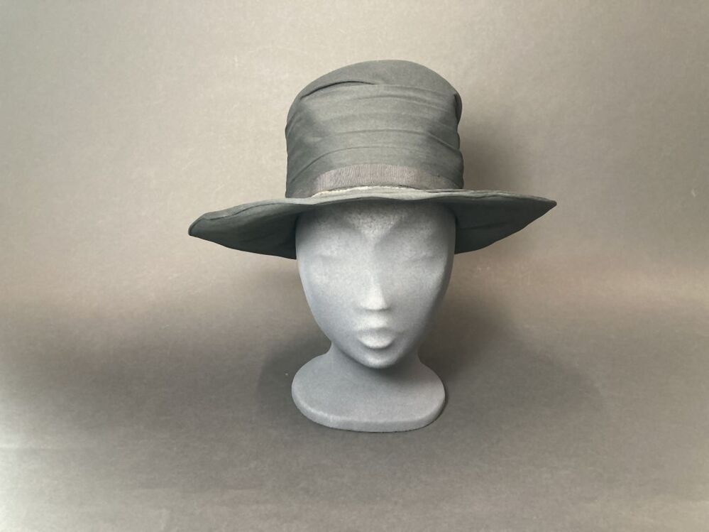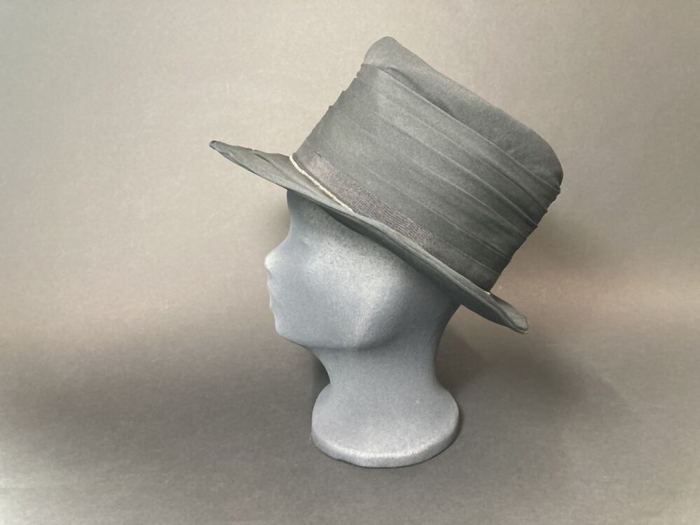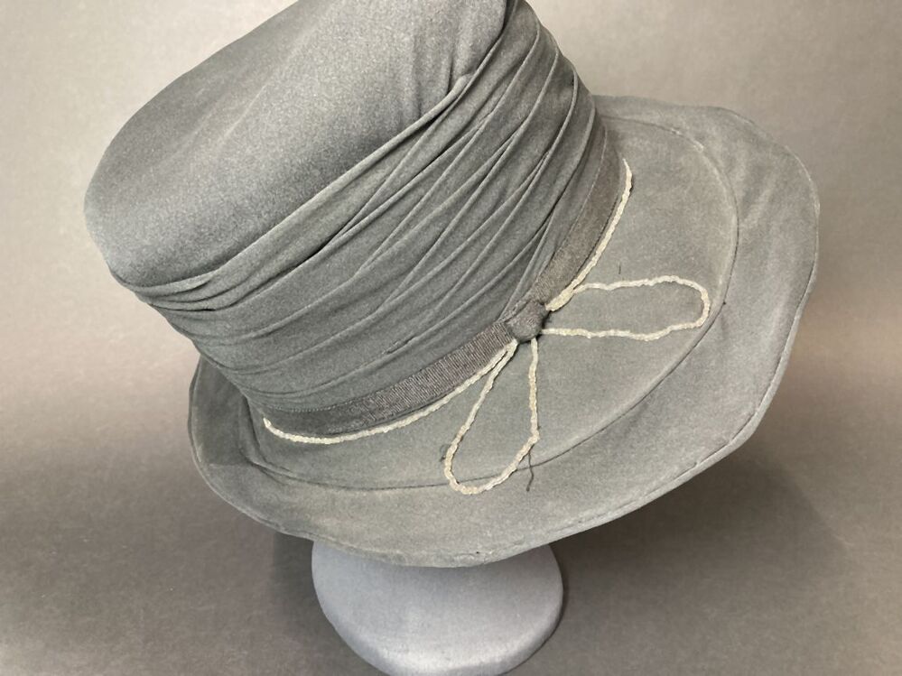 Hoed van zwarte crèpestof, over rieten basis met dubbele rand en kraaltjes decoratie