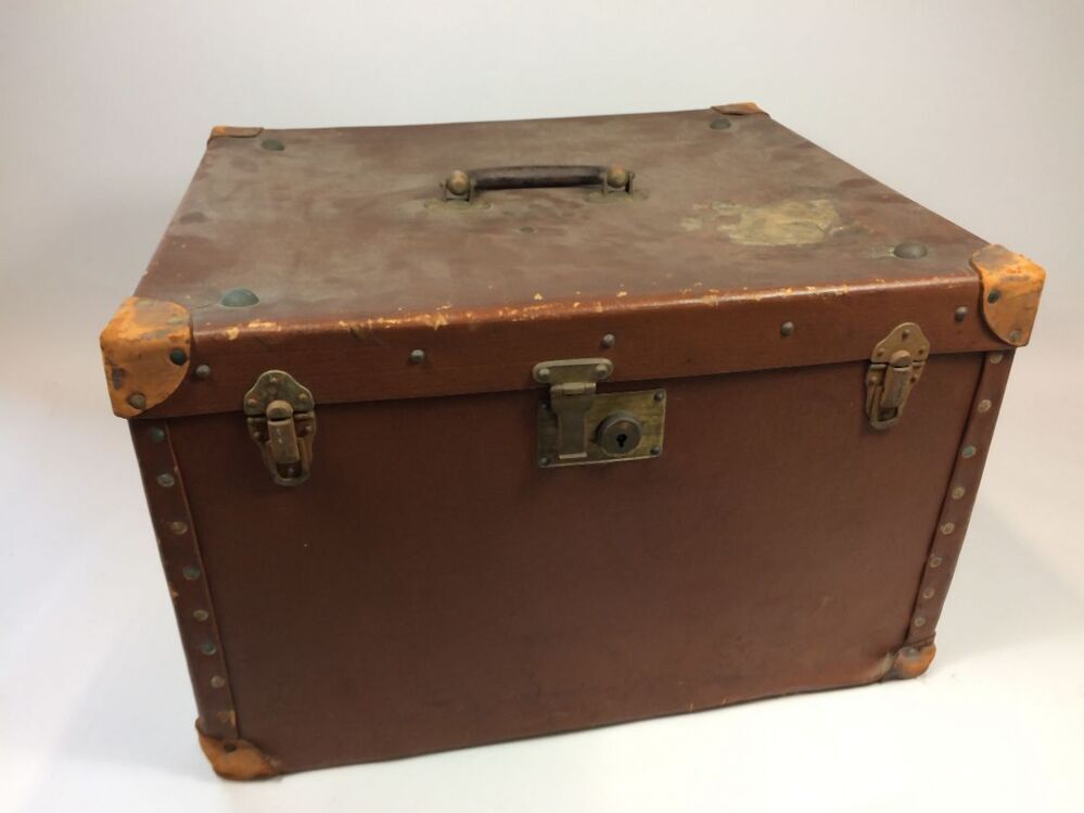 Koffer van geperst board, bruin geverfd, deksel scharniert aan de lange zijde