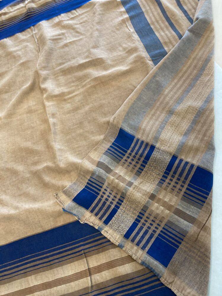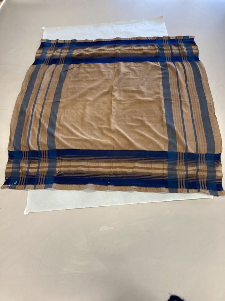 Omslagdoek met middelbruin fond rondom een brede rand met effen blauwe strepen