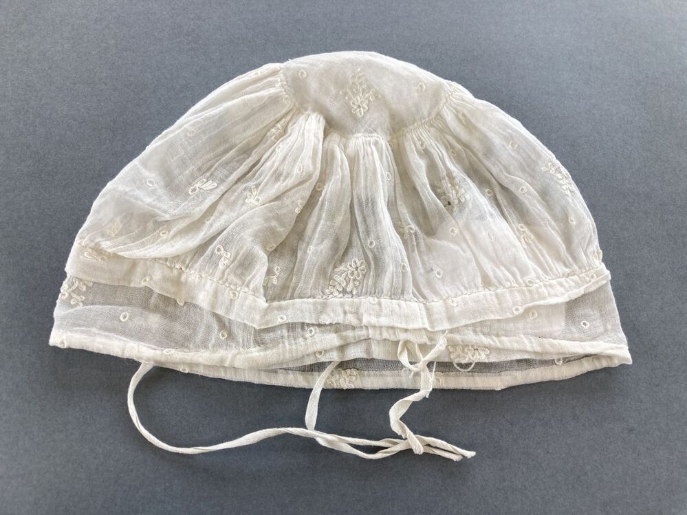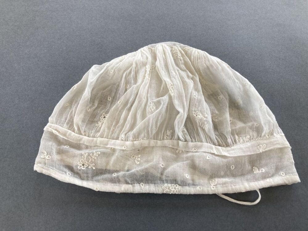 Kindermutsje van wit neteldoek, cirkelvormig bolletje waaraan een strook gerimpeld is, die ingehouden aan een band is gezet, tamboereerwerk, strooimotiefjes