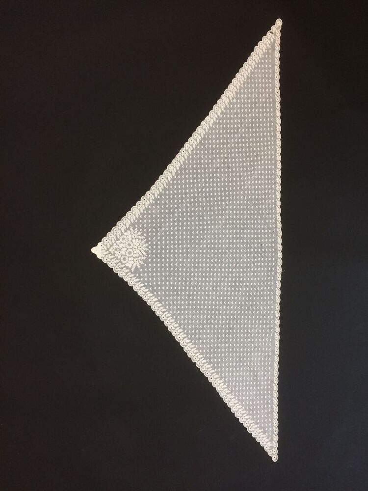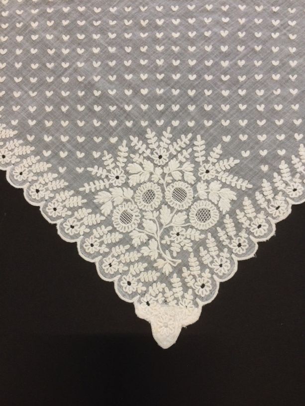 Driekantige halsdoek van wit neteldoek bezaaid met kleine pompeblêden en waaiervormig bloemmotief in de punt