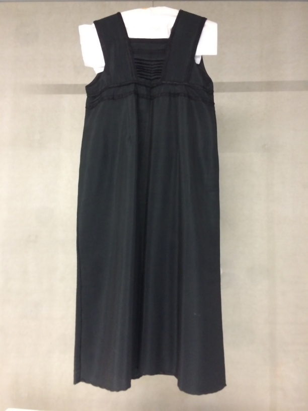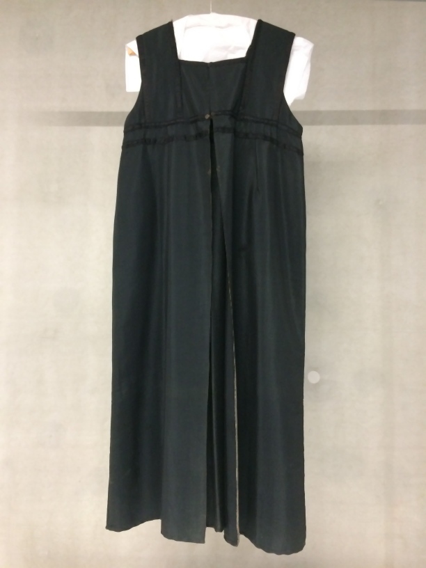 Lang luster schort met kort bovenlijfje, brede schouderbanden, afgezet met zwart satijnband onderdeel van groep van vier schorten