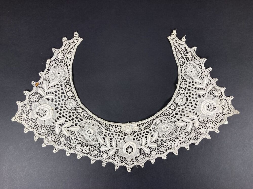 Cremekleurige kraag van etskant, in punt uitlopend op de schouders, onderdeel van groep van drie