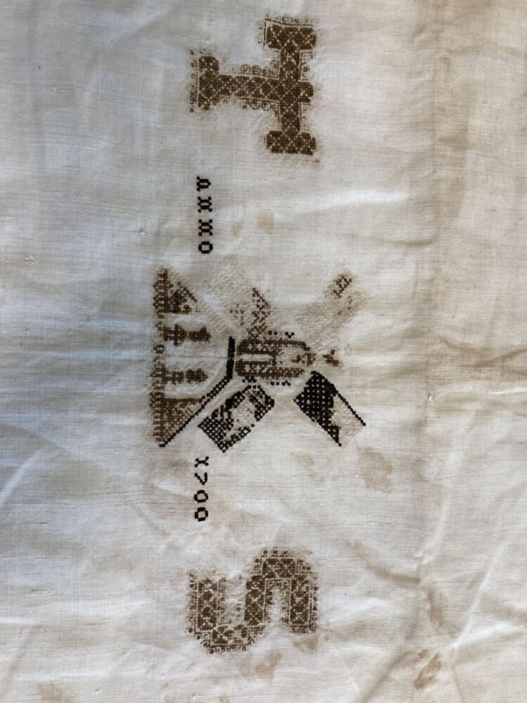 Linnen laken geborduurd met zwart-bruine zijde en katoen, T anno molen 1700 S